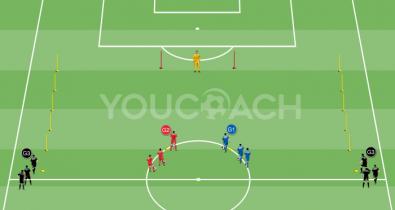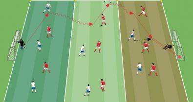 Catene di passaggi a tre giocatori con due palloni per conclusioni a rete ravvicinateTécnica