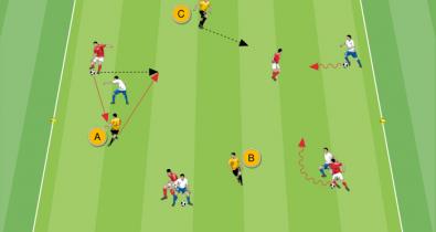 El ejercicio comprende continuas situaciones de 1vs1 con un comodín que juega como apoyo para los compañeros en posesiónTáctica