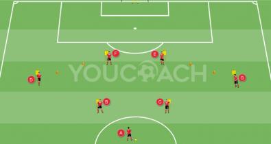 Situación simplificada para entrenar los intercambios en espacios reducidos y la finalización en porteríaTáctica