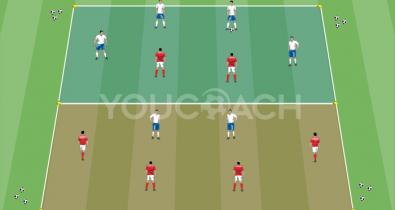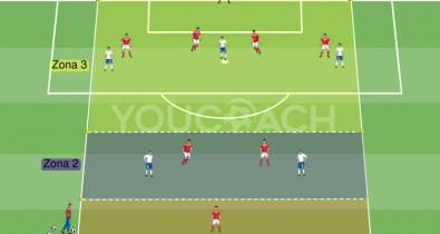 Ejercicio situacional para entrenar a los jugadores a crear superioridad numérica en la zona central del campoTécnica