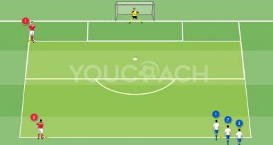 Posicionar 4 palos en el limite del área, simulando una defensa de 4 defensores. Colocar tres conos a 10 metros del limite del área, dividiendo a los jugadores en 3 filas (como en la figura). Los...Páginas