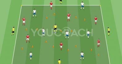 Juego condicionado 7vs7 con comodín interior y apoyos exteriores para mejorar la posesión de balón en superioridad numéricaTáctica