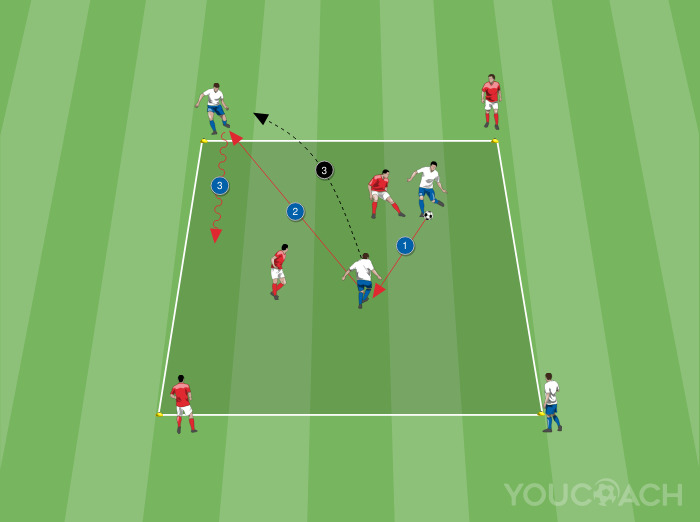 - Los jugadores juegan 2vs2 en el cuadrado e intentan jugar con uno de los jugadores del mismo equipo que esta en el ángulo. Una vez que un pase llega al jugador del ángulo este ultimo entra, después de un control orientado, en el cuadrado para jugar el 2vs2 con su compañero de equipo. El jugador que pasa el balón al jugador exterior toma su sitio.
