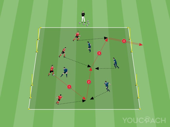 Ejercicio típico de la cantera del Manchester United FC, este 4vs4 Small-sided Game (SSG) ayuda a los jugadores a colocarse correctamente en el campo de juego y a crear ocasiones de gol. Se puede usar como calentamiento o como parte de una sesión táctica, y la idea del juego permanece inalterada, permitir a los jugadores encontrar por si solo la solución a los problemas que se presentan en los partidos. El entrenador tendrá que evitar dar indicaciones precisas a los jugadores sobre que hacer y como hacerlo.