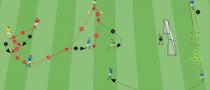 Se usan 3/4 partes del campo para el ejercicio. Posicionar 2 porterías en ambos lados cortos (como en la figura). Fuera de las dos líneas del fondo del campo, entre las porterías, se coloca un "pasador" con un buen número de balones. En el interior del terreno de juego se colocan 7 jugadores blancos contra 7 jugadores rojos con la presencia de 2 comodines verdes. Balón para un equipo para el inicio del ejercicio.