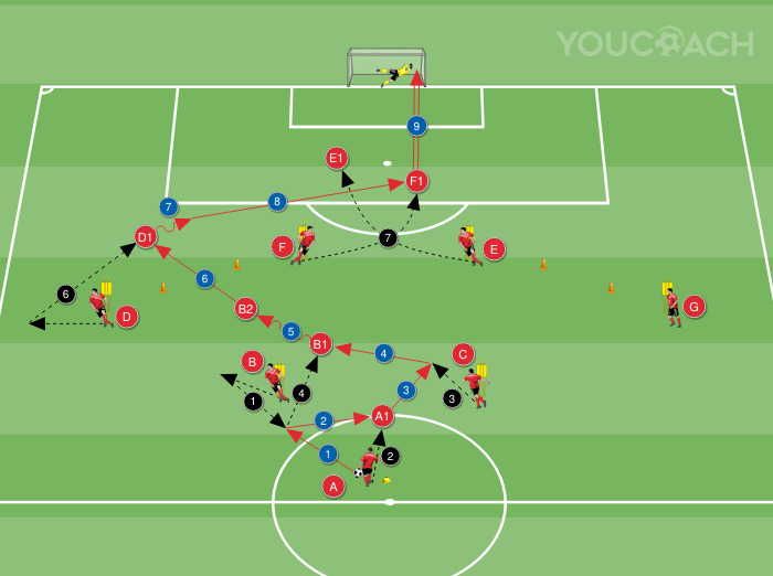 - D realiza un control orientado mientras los dos delanteros E y F se cruzan en E1 y F1 intentando no caer en fuera de juego con movimientos de media luna