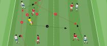 - Aumentar las dimensiones del cuadrado de juego y añadir un delantero y un defensor creando de este modo una situación de juego de 4vs3 siempre en superioridad numérica a favor de los delanteros (progresión táctica)