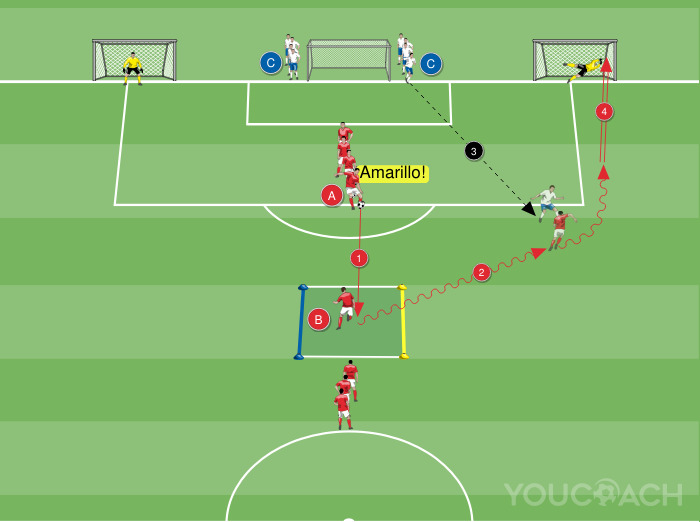 - Con la señal del entrenador, el jugador A pasa el balón hacia B que está en el interior del cuadrado y dice un color (en el ejemplo de la figura dice el color "amarillo")