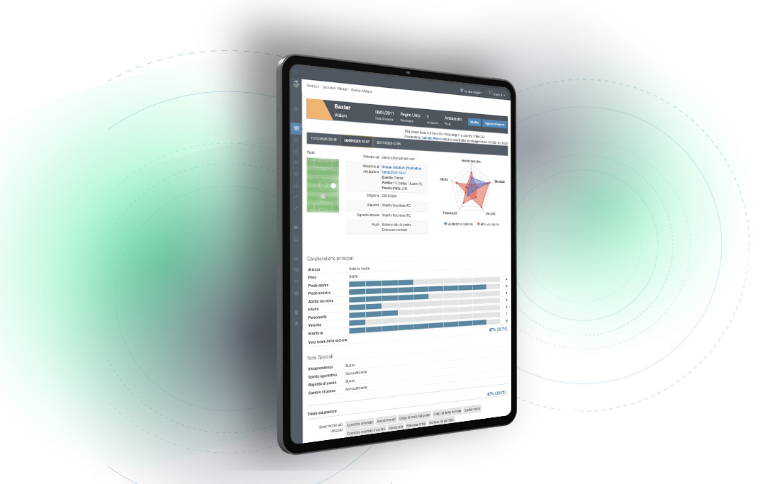 Con YouCoach App Scout, el club puede configurar fichas de evaluación personalizadas, perfectamente alineadas con su propio sistema de valoración de jugadores, definiendo atributos técnicos, tácticos, físicos y comportamentales específicos, puntuaciones y comentarios cualitativos que reflejen la filosofía del club. Asimismo, el club puede decidir cómo utilizar los distintos parámetros para construir índices, por ejemplo sumando elementos de evaluación similares, o gráficos personalizados.