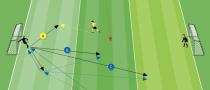 - En esta tarea se desarrollan dos temas muy importantes en la fase ofensiva: el primero la amplitud, dada principalmente por los dos comodines en figura de apoyo que dan siempre una solución de juego y mantenimiento de balón, sea por la disposición de las porterías laterales (diagonales amarillas) que permiten la jugada en el exterior y sucesivo desarrollo del balón colgado o intercambios rápidos para el tiro a portería