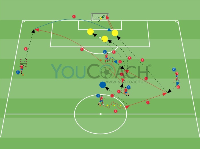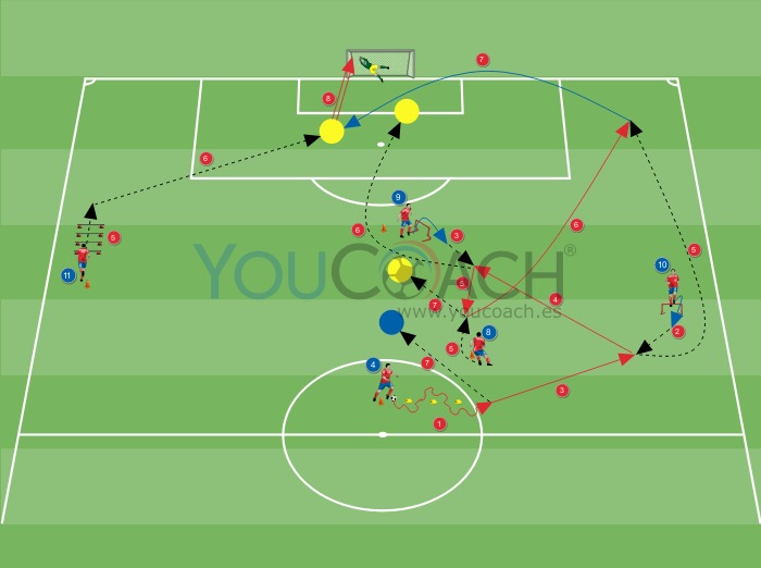 La zona de juego sera la mitad de un campo reglamentario. En el interior del campo se colocan, al lado del cono, un pivote (4) con el balón, un interior derecho (8), un delantero centro (9) y dos extremos (10 y 11). A la derecha del pivote posicionar una fila de 3 chinos, detrás del extremo derecho colocar un obstáculo, a la derecha del delantero centro posicionar un obstáculo y delante del extremo izquierdo colocar 4 over. El portero en la portería.