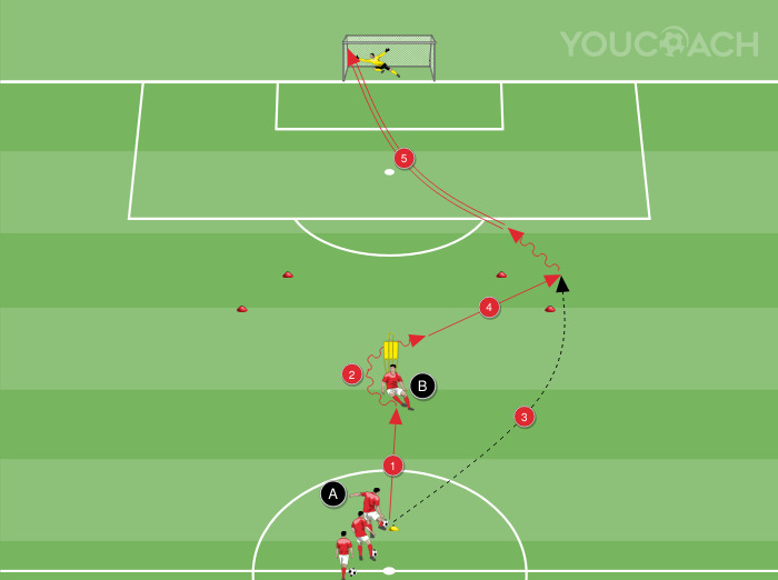 El área en la que se realiza el ejercicio coincide con la zona adyacente al área grande. Colocar un palo a unos 5 metros del área grande, en posición central. Posicionar un chino a unos 10 metros del palo, central (posición de salida del delantero). Posicionar 2 chinos en cada lado del palo, formar un target de unos 3 metros, en diagonal, a través el cual tendrá que pasar la asistencia para el delantero (como en la figura). Los jugadores salen desde el chino (A), con el balón. Un jugador (B) se coloca en el palo, de espaldas a la portería. Los porteros en la portería.