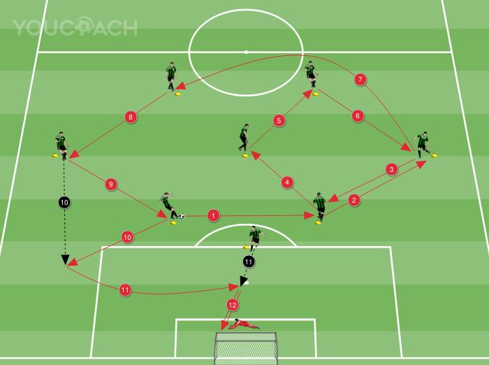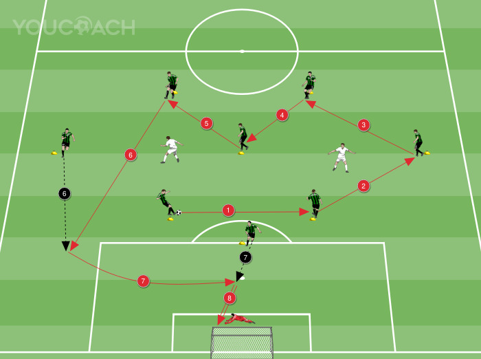 - Los jugadores deben seguir el orden de los pases para llegar al centro y a la finalización a portería.