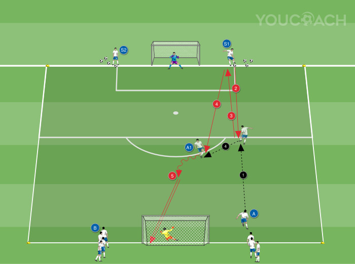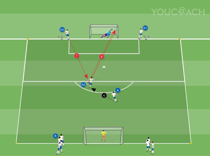- Los jugadores S1 y S2 tienen que pasar el balón lo mas preciso posible para facilitar el tiro a portería del compañero