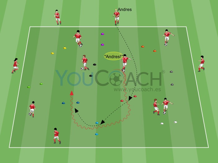 Con la señal de inicio del entrenador los seis jugadores interiores conducen el balón. Los jugadores en conducción de balón tienen el deber de llamar a un compañero posicionado en el exterior del rectángulo desafiándolo de este modo a la conquista del balón. Si el jugador en conducción consigue entrar en un determinado numero de porterías (decido por el entrenador al inicio del turno) sin que le roben el balón, la persecución termina. Si el jugador que ha sido llamado consigue tocar el balón del compañero, el turno de juego termina y se realiza un cambio de posición.