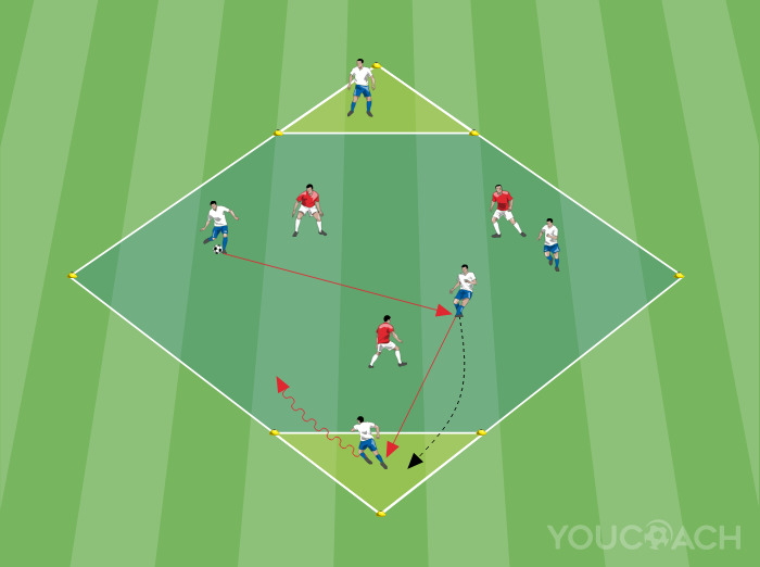 - El ejercicio, es muy útil en la fase de activación o inmediatamente después, permite trabajar la gestión del balón en espacios reducidos buscando la máxima movilidad de los jugadores, que deben encontrar líneas de pase hacia objetivos específicos (los apoyos) y, cuando estos estén cerrados por los defensores, deben buscar otras estrategias de éxito buscando la máxima amplitud de maniobra (proporcionada por la particularidad del rombo, más ancho que profundo).