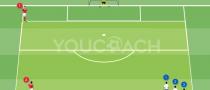 Ejercicio que entrena la conducción de balón, 1 contra 1 y el tiro a portería. |