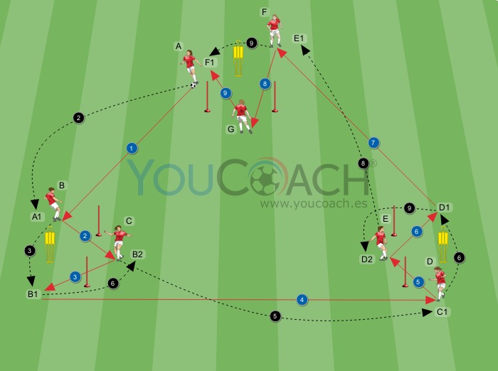 - C pasa hacia el compañero A hacia el moviendo y haciendo pasar el balón entre los dos palos; B sprinta a la espalda de C yendo hacia el otro vértice en B1
