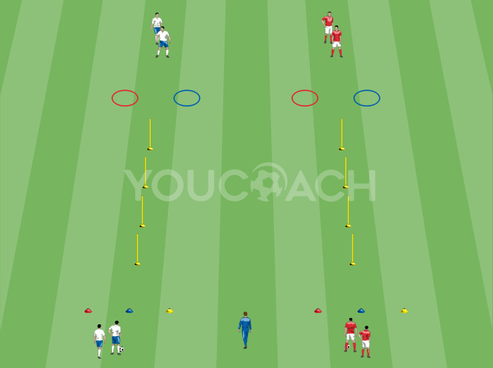 Dividir a los jugadores en dos equipos de 6 componentes. Cada equipo esta formado por parejas de jugadores de tres colores (2 rojos, 2 verdes, 2 amarillos). Los jugadores del mismo equipo estan indicados por un circulo en la figura.