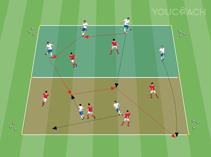 Partido táctico 6 contra 6 con el campo dividido en dos zonas y objetivo de metaObjetivos secundarios