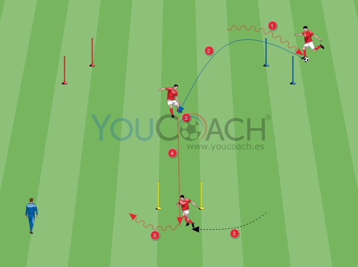 - A un cierto punto el entrenador dice un color (ej. ''Azul'') y el jugador con el balón tendrá que finalizar rápidamente hasta llegar a la portería y realizar un pase hacia el jugador del centro