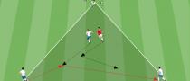 - B realiza un control orientado y pasa el balón hacia C, en el vértice ''V3''. Mientras A rodea el cono en sprint y va hacia el vértice ''V2'' tomando el sitio de B (como en la figura 2)