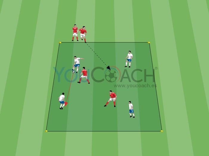 - Los 4 jugadores blancos tienen que mantener la posesión de balón durante un minuto contra los 4 jugadores rojos que entran en el interior del cuadrado uno cada vez 10 segundos hasta que se juego un 4vs4
