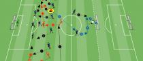 Posesión de balón 5 vs 4 con transición negativa en una situación de 2 atacantes vs 2 defensores para finalizar |