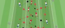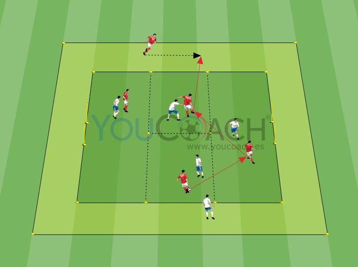 - Se crea una serie de 1vs1 en espacios reducidos que obligan al pase inmediato y al desmarque de los compañeros