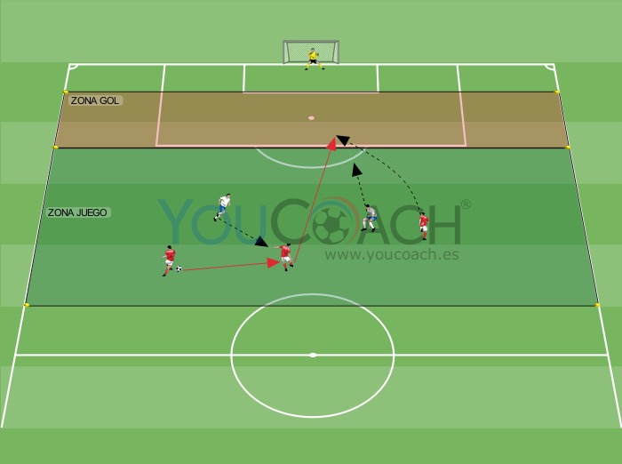 - Cada vez que los jugadores A reciben el balón en ZONA GOL después de un intercambio con pases al hueco reciben 2 puntos