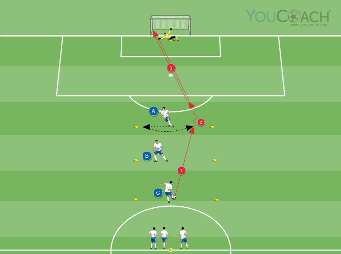 A 25 metros do gol, coloque um par de marcadores a 10 metros de distância, onde o jogador A é colocado no centro. A 10 metros do par de marcadores (35 metros do gol), coloque um segundo par de marcadores onde o defensor B é colocado no centro. Finalmente, a 10 metros do segundo par de marcadores, forme um terceiro par de marcadores (45 metros do gol) onde o jogador C é colocado no centro. Perto do meio-campo, coloque um marcador onde o resto dos jogadores esperará a sua vez.