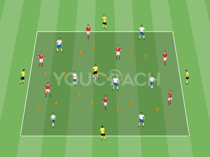 Posesión de balón - Juego condicionado 7vs7 con comodín interior y apoyos exteriores para mejorar la posesión de balón en superioridad numérica -